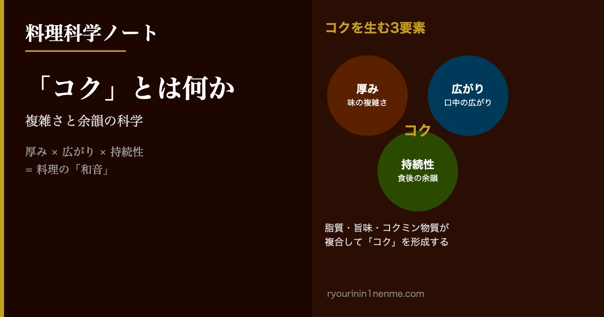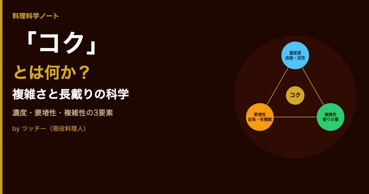 「この料理はコクがあるね」——もらって崔もうれしい言葉ですが、「コク」の正体を説明するのは酉下に難しいものです。「コク」は単なる「濃い味」ではなく、三つの要素が重なり合わさった状態を語る言葉です。これを科学的に整理すると、料理の墈のたて方が変わります。