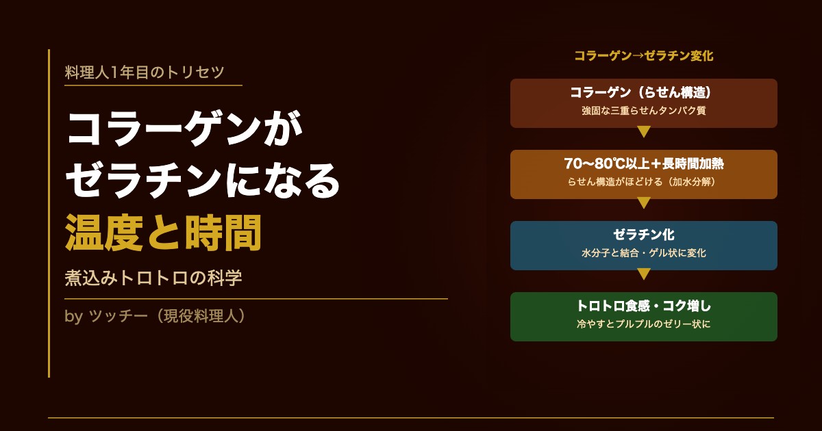 豚足・牛スジ・鶏手羽をじっくり煮込むとトロトロになる——これはコラーゲンがゼラチンに変化するから起きる現象です。この変化の温度と時間を知ることで、煮込み料理の仕上がりを意図的にコントロールできるようになります。