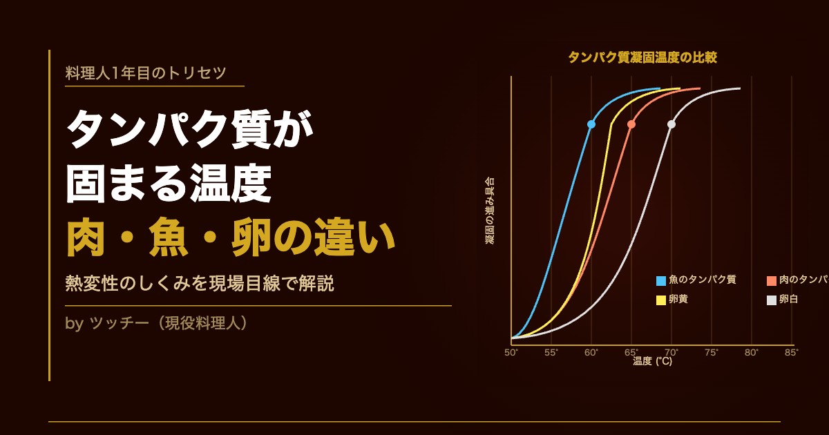 肉を65℃で仕上げるのと、魚を65℃で火入れするのでは、食感がまったく違います。同じ温度なのに、なぜ? 答えは「タンパク質の種類と、それぞれが固まる温度が違う」から。この違いを知るだけで、火入れの精度がグッと上がります。