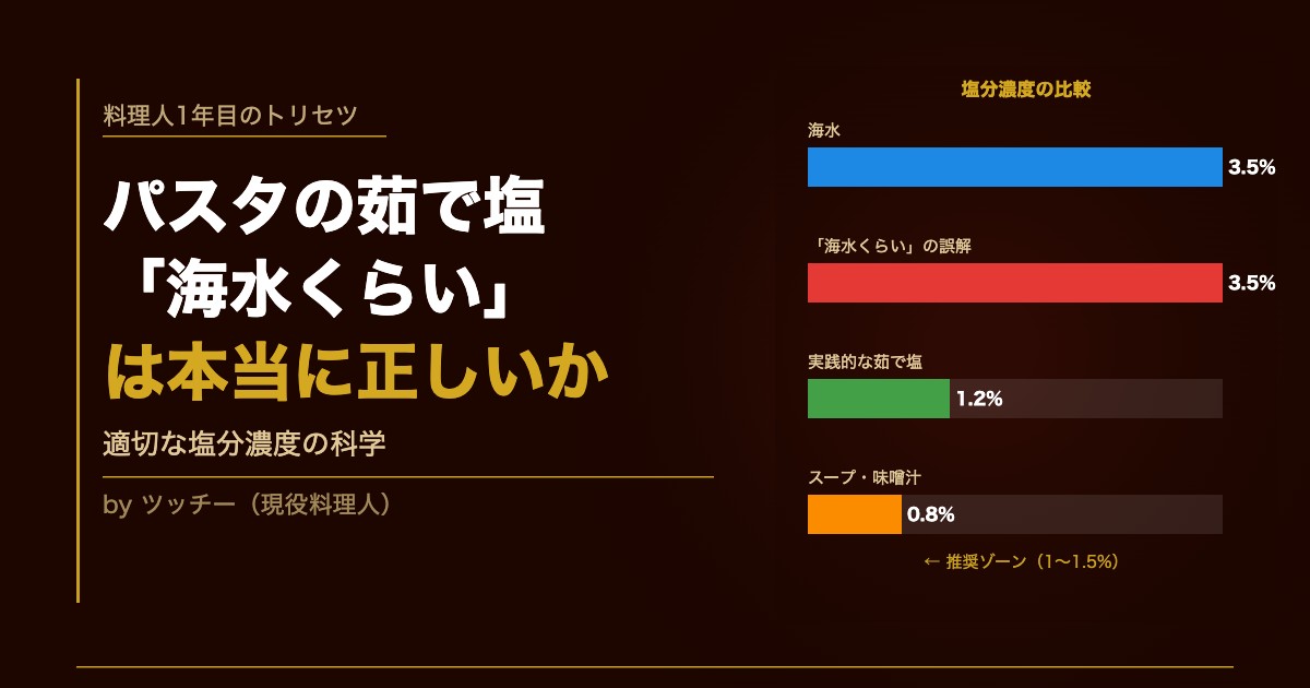 「海水くらい」は「ケチらずしっかり使え」という職人のたとえ話。実際の海水濃度3.5%でパスタを茹でると、食べられないほど塩辛くなります。格言は「方向性」を示すもの——数字は自分で検証しましょう。