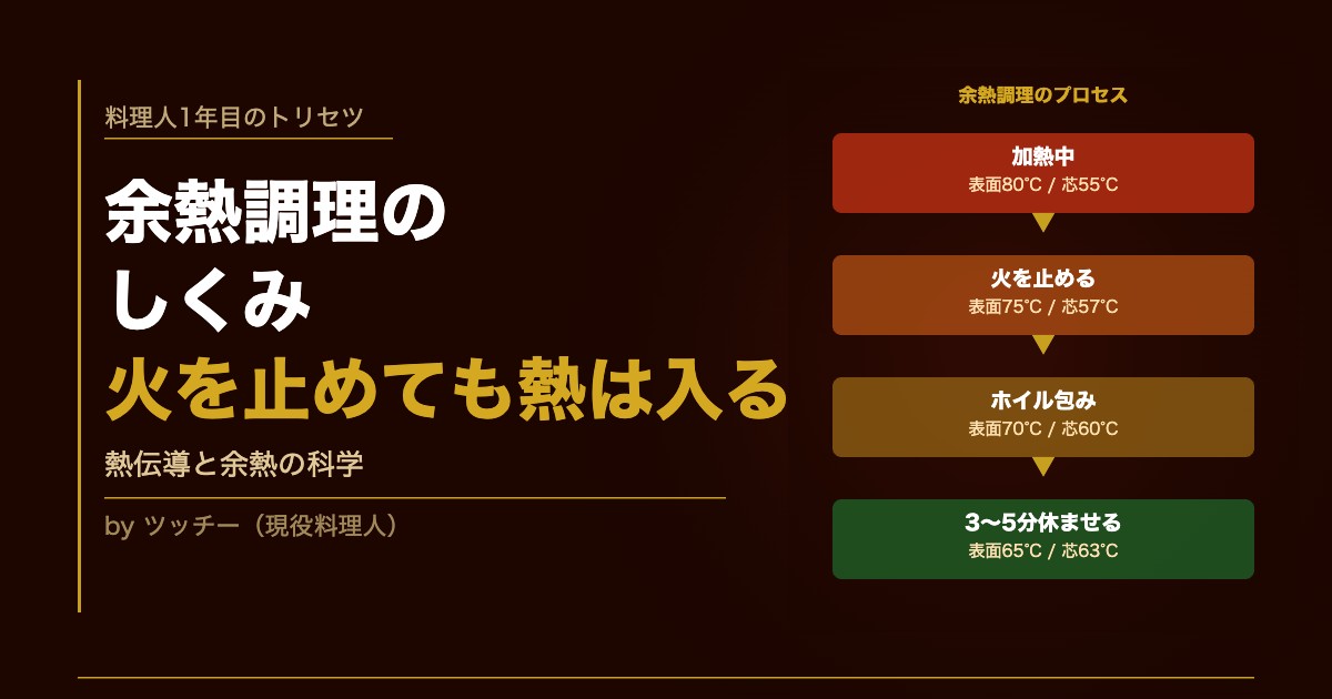 鶏むね肉を鍋から取り出した直後、「まだ火が通ってない」と感じたことはありませんか?でも数分後に切ってみると、ちゃんと中まで火が入っている——これが余熱調理の力です。プロの現場では当たり前のように使うこの技術、実は物理的なしくみがあります。