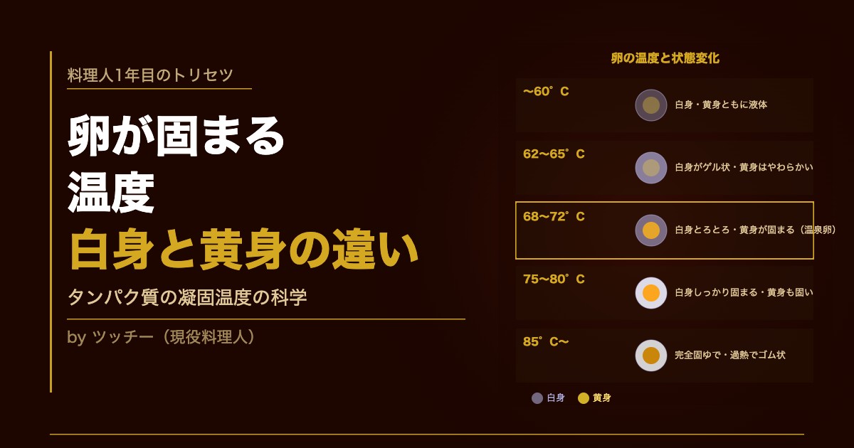 温泉卵はなぜ白身がとろりとして黄身だけ固まるのか——その答えは白身と黄身でタンパク質の種類と凝固温度が異なることにあります。この違いを理解すると、卵料理の仕上がりを温度でコントロールできるようになります。