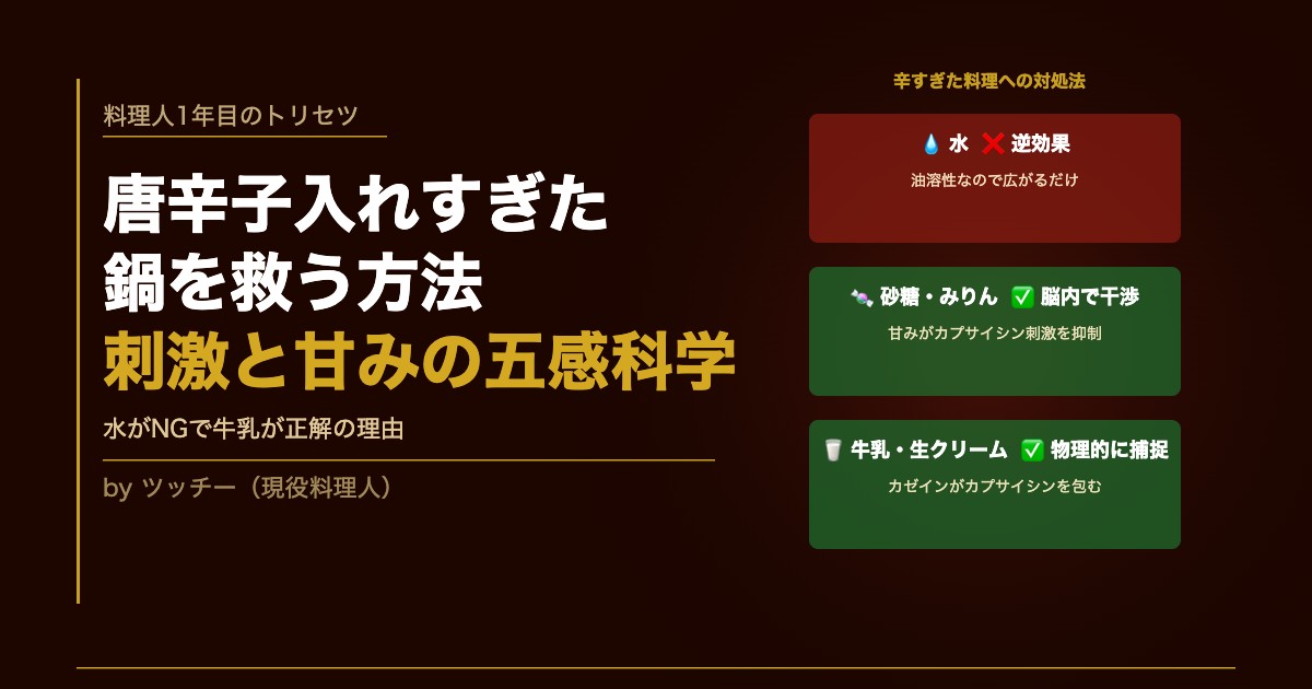 一方で乳製品(牛乳・生クリーム)が効果的なのは、含まれるカゼインタンパク質がカプサイシンを物理的に包み込んで洗い流すためです。砂糖(甘み)は脳内での干渉で辛みを和らげ、乳製品は物理的にカプサイシンをキャッチする——この2つは異なるメカニズムで辛さを抑えています。