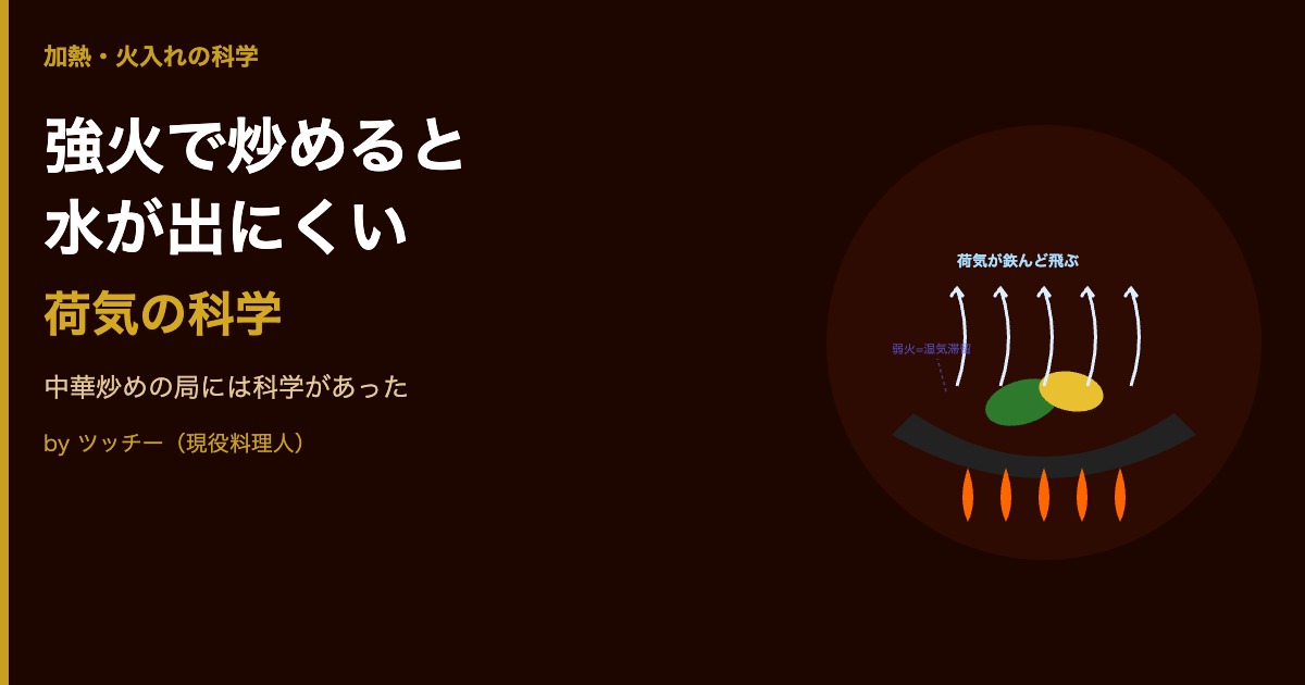 「フライパンの温度を下げるな」「少量ずつ入れろ」「炒めるときは強火で」——これらの指示は全て共通の科学的原理に基づいています。「荷気」の仕組みを理解すれば、水っぽい炒め物の心配がなくなります。