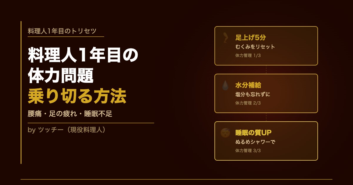 料理人1年目のほとんどの人が、最初の数ヶ月でこう思います。毎日8〜10時間、ほぼ立ちっぱなし。重い鍋や食材を持ち続け、ピーク時間は走り回る。気温も暑い厨房の中で、汗だくで動き続ける。