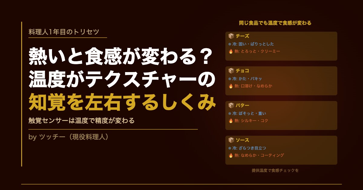 「食感は口に入ったときに決まる」——この言葉を改めて深く考えると、温度管理の意味が見えてきます。調理中の感触だけでなく、提供したときの温度帯でどう感じるかを常にイメージする習慣が、料理のクオリティを一段上げる鍵になります。
