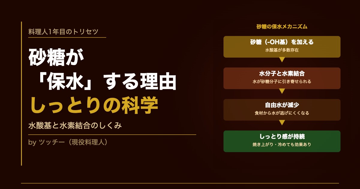 砂糖は「水分を引き寄せるスポンジ」——食材の中に砂糖があると、水分がそこに集まって離れにくくなります。これが「しっとり」の正体です。
