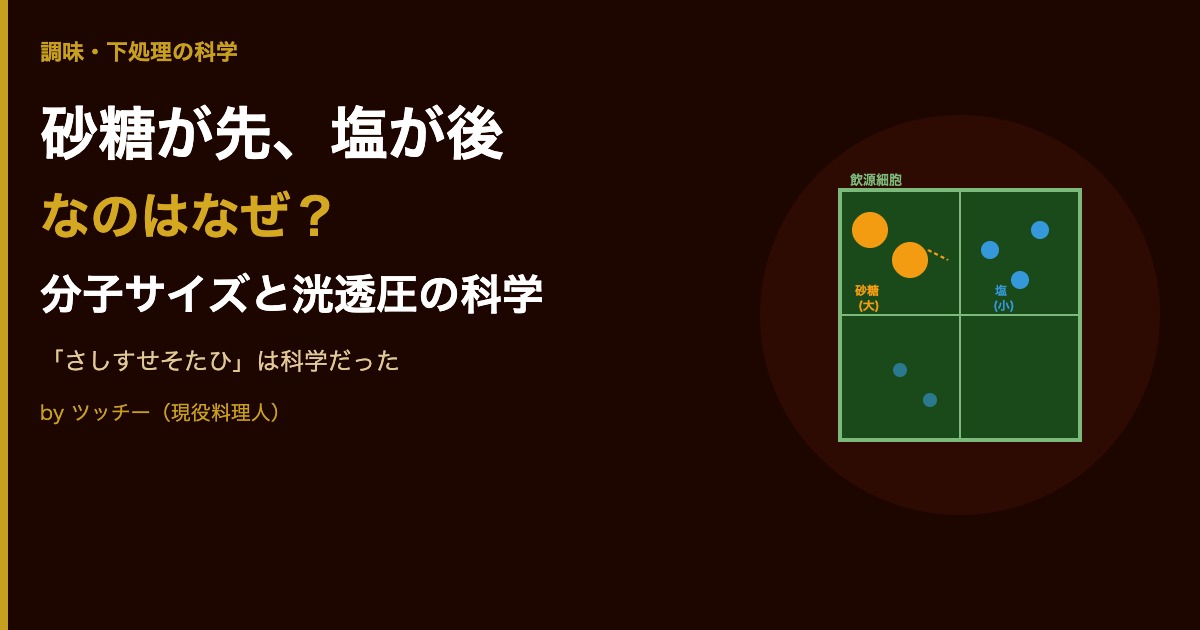 「さしすせそたひ」——日本料理の定番の調味順序です。でもこれ、なぜ「砂糖が先、塩が後」なのか、正确に説明できる人は意外と少ないものです。実は洸透圧の科学と分子サイズの関係が、この運序の従えます。