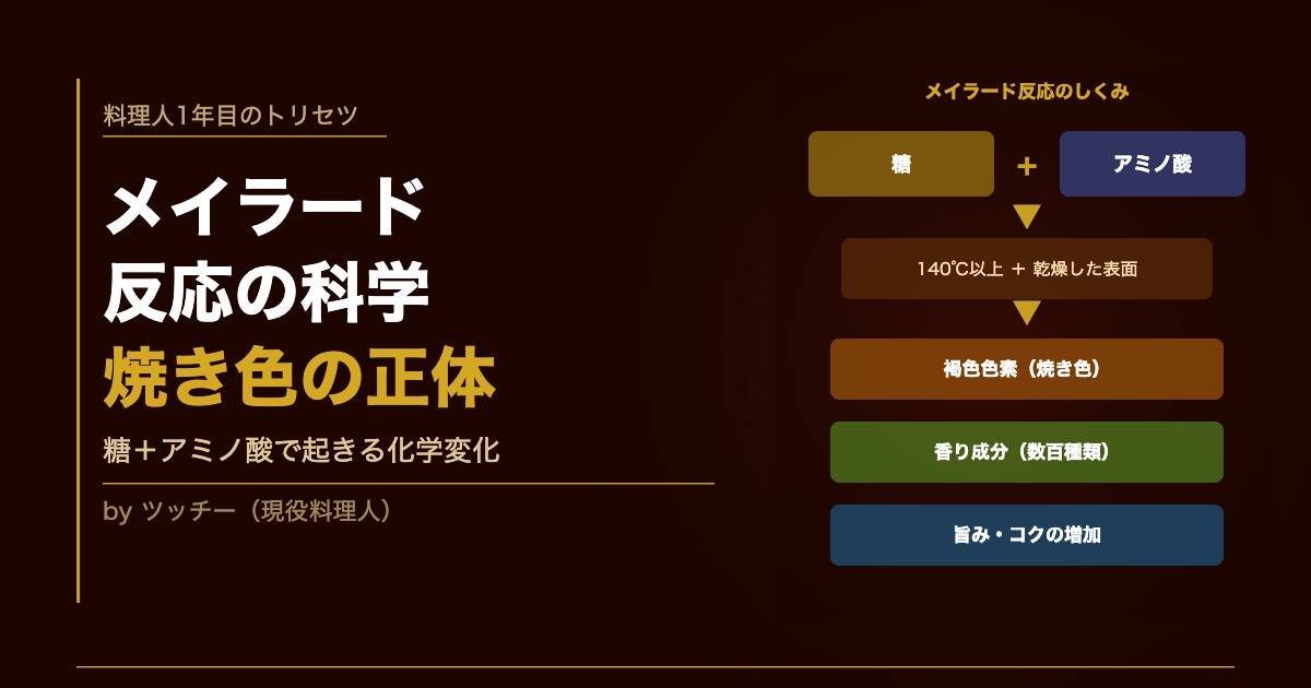糖とアミノ酸が出会って「化学的な料理」をする——その産物が焼き色と香り。材料が揃い、温度と乾燥という環境が整ったときだけ起きる、計算できる反応です。