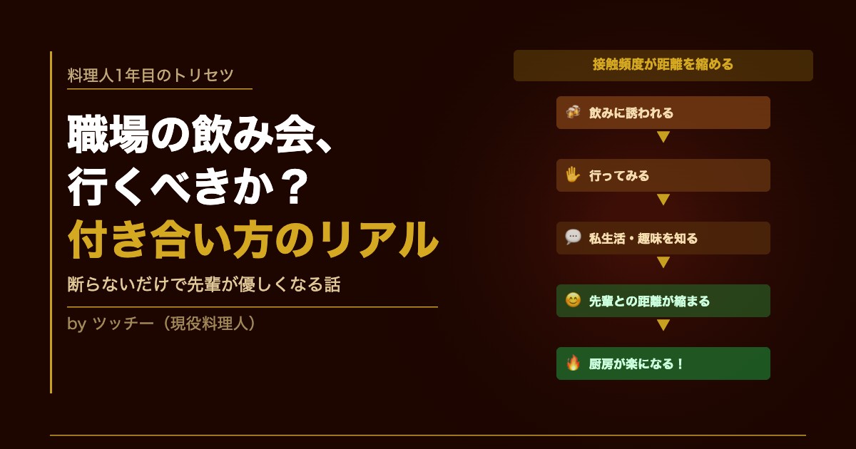 飲み会は「厨房外の自主練」。包丁の技術は磨けないけど、人間関係という武器が手に入る。しかも努力ゼロ、「行くだけ」でOK。コスパで考えたら、1年目が取れる行動の中でもトップクラスだと思っています。
