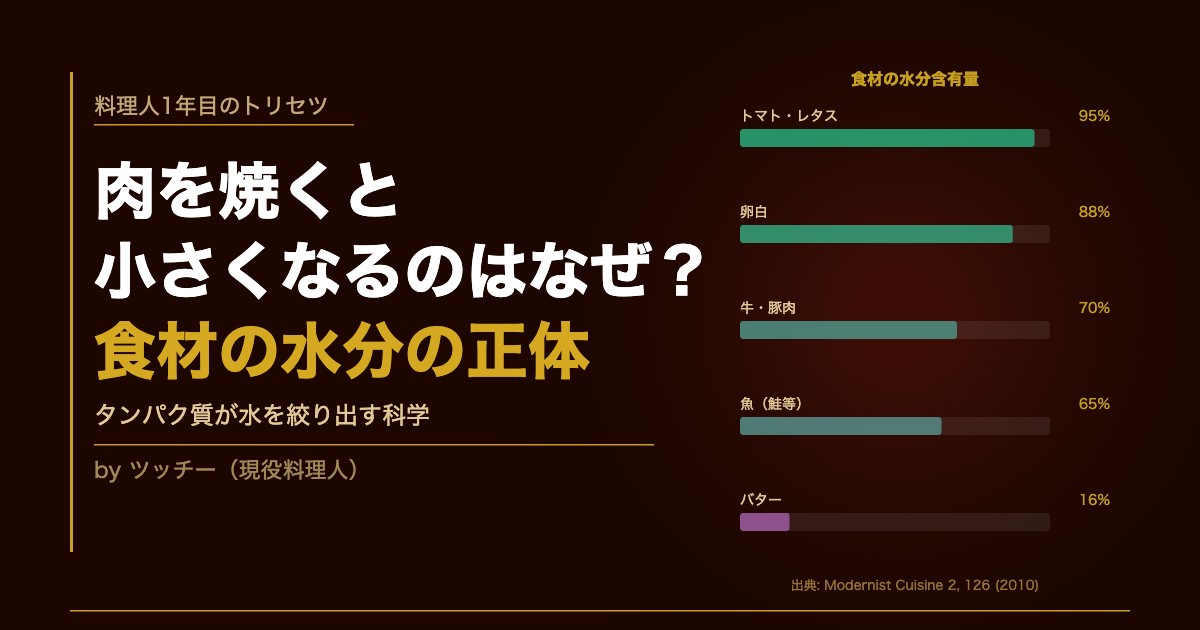 ① 肉は65〜72%が水分——加熱で縮むのは「タンパク質が水を絞り出す」から