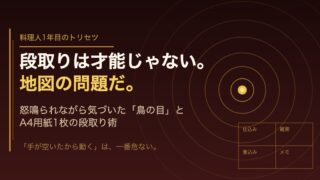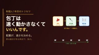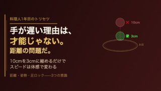 「包丁は速く動かさなくていい」——手が早い人は、センスじゃなく配置で動いています。原体・まな板・受け皿を一方向に並べる「導線設計」で、考えなくても速く動ける状態を作る方法を実体験から解説。